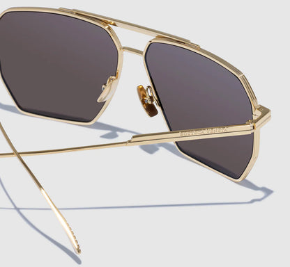 Full metal and super light masculine contemporary caravan shape defined by metal double bridge and rim decoration reminding to the fringed ribbon detail. Metal temples embellished by the new iconic fringed ribbon detail. Bottega Veneta logo finely laser engraved on the external side of temples. Anti slipping details on the internal part of the endtips. Colour palette well balanced between matte and shiny metals, enriched by a mix of classic and mirror lenses.